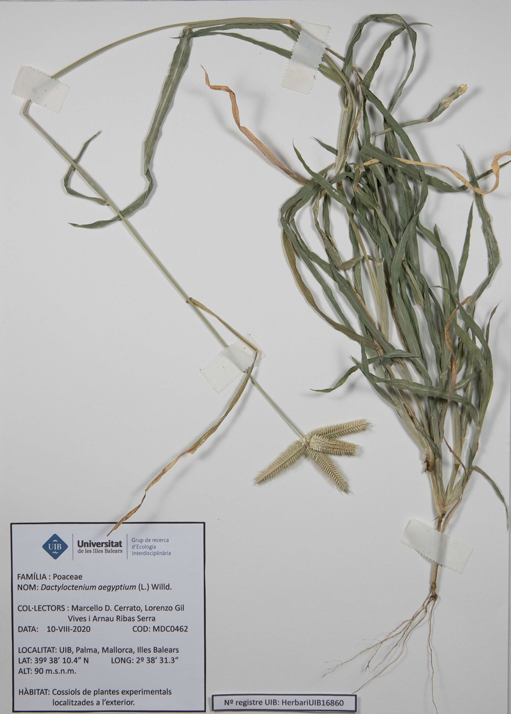 Fig. 1.Herbarium specimen of Dactyloctenium aegyptium (L.) Willd. collected in experimental pots on the Univeristy of the Balearic Islands in 2020 (HerbariUIB 16860).