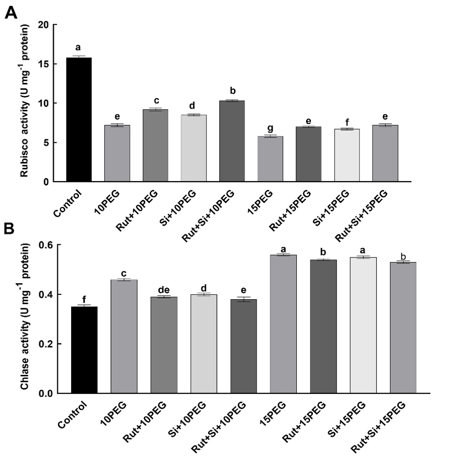 In conclusion, the results of this study show that the application of Rut, Si, or Rut+Si to maize plants under osmotic stress can suppress chlorophyll degradation and stimulate chlorophyll synthesis and Rubisco activity, thereby preserving photosynthetic activity. Rut, Si, and especially Rut+Si applications have the potential to maintain photosynthesis or alleviate photosynthetic damage in plants under osmotic stress. Our research was aimed at a better understanding of the key mechanisms underlying Rut+Si-mediated osmotic stress tolerance. Furthermore, the study may help to address gaps in knowledge regarding the effects of Rut on stress tolerance. By using the benefits of Rut and Si, researchers may be able to plan more sustainable agriculture. Based on the findings of the current study, we can conclude that the application of Rut and Si or their combination to plants subjected to osmotic stress can improve plant growth and provide the plants with an advantage under stress conditions.