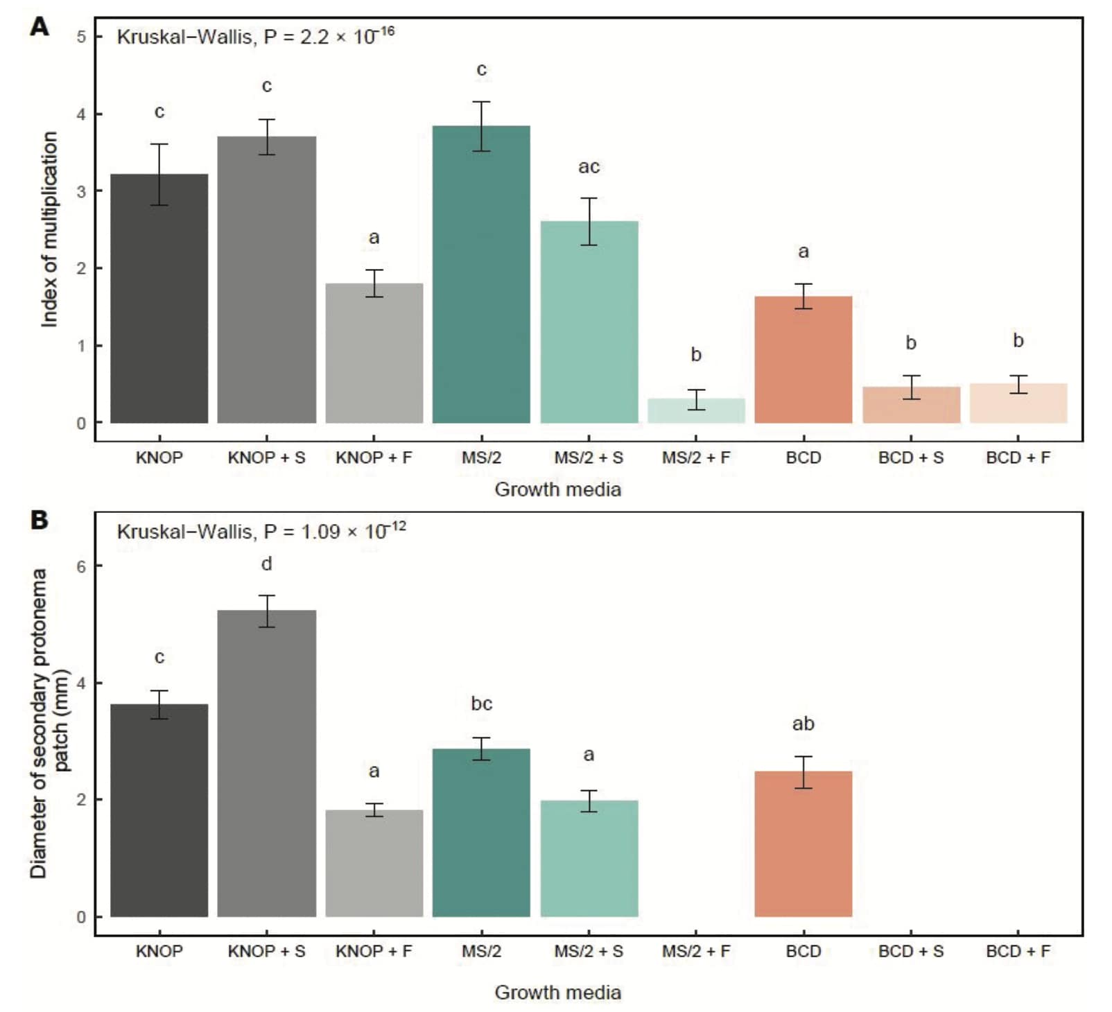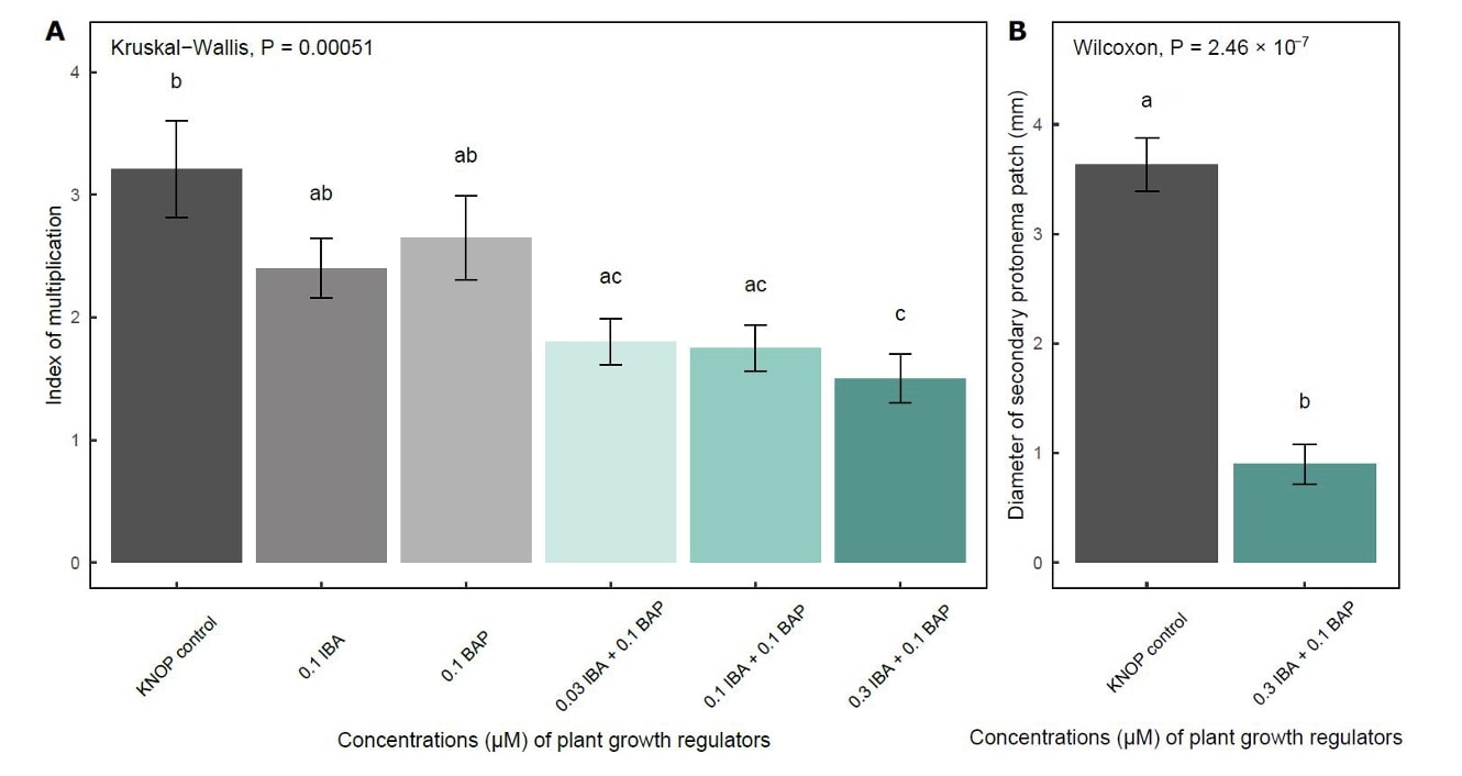 Fig. 4. The effect of KNOP growth media supplementation with the plant growth regulators on the index of multiplication (A) and diameter of secondary protonema patch (B) in experiment type II. The data are presented as the mean ± standard error. Different letters above the bars denote statistically significant differences (P < 0.05) between the experimental groups.