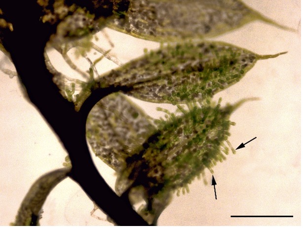Fig. 3. The formation of secondary protonemal threads from phylloid cells (arrows) in Entoshtodon pulchellus explants grown on MS/2 medium supplemented with fructose. Scale bar = 200 µm (magnification 10×).