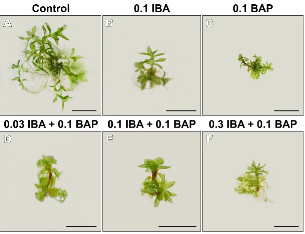 The plants grown on the KNOP media supplemented with PGRs developed normal phylloids and protonema, albeit smaller than the plants in the control group (Fig. 5). The formation of small buds which did not develop into long shoots were documented in the plants grown on the medium with a combination of IBA and BAP (Fig. 5D-F).