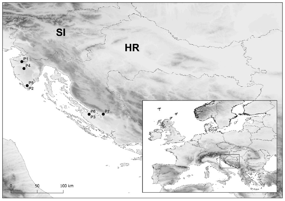 Fig. 1. Geographic locations of the studied Crataegus monogyna (P1-P3) and Pyrus spinosa (P4-P7) populations. Populations: P1 – Buje; P2 – Pula; P3 – Nin; P4 – Škropeti; P5 – Pula; P6 – Nin; P7 – Obrovac. The rectangle on the map in the lower right corner indicates the research area in the SE European context. Abbreviations: SI – Slovenia, HR – Croatia.