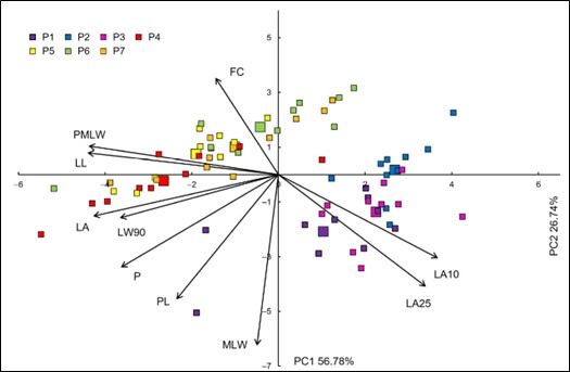 Principal component analysis (PCA) was conducted, based on 10 morphological leaf traits. The two first principal components explained 83.52% of the total variability, with additional 9.95 and 3.36% explained by the third and fourth principal components, respectively. Five traits were in a high negative correlation with the first principal component (LA, P, LL, PMLW, LW90) and two traits were in a high positive correlation with the same component (LA10, LA25). The second principal component was in a high negative correlation with MLW, while the third principal component was highly positively correlated with FC (Tab. 4).