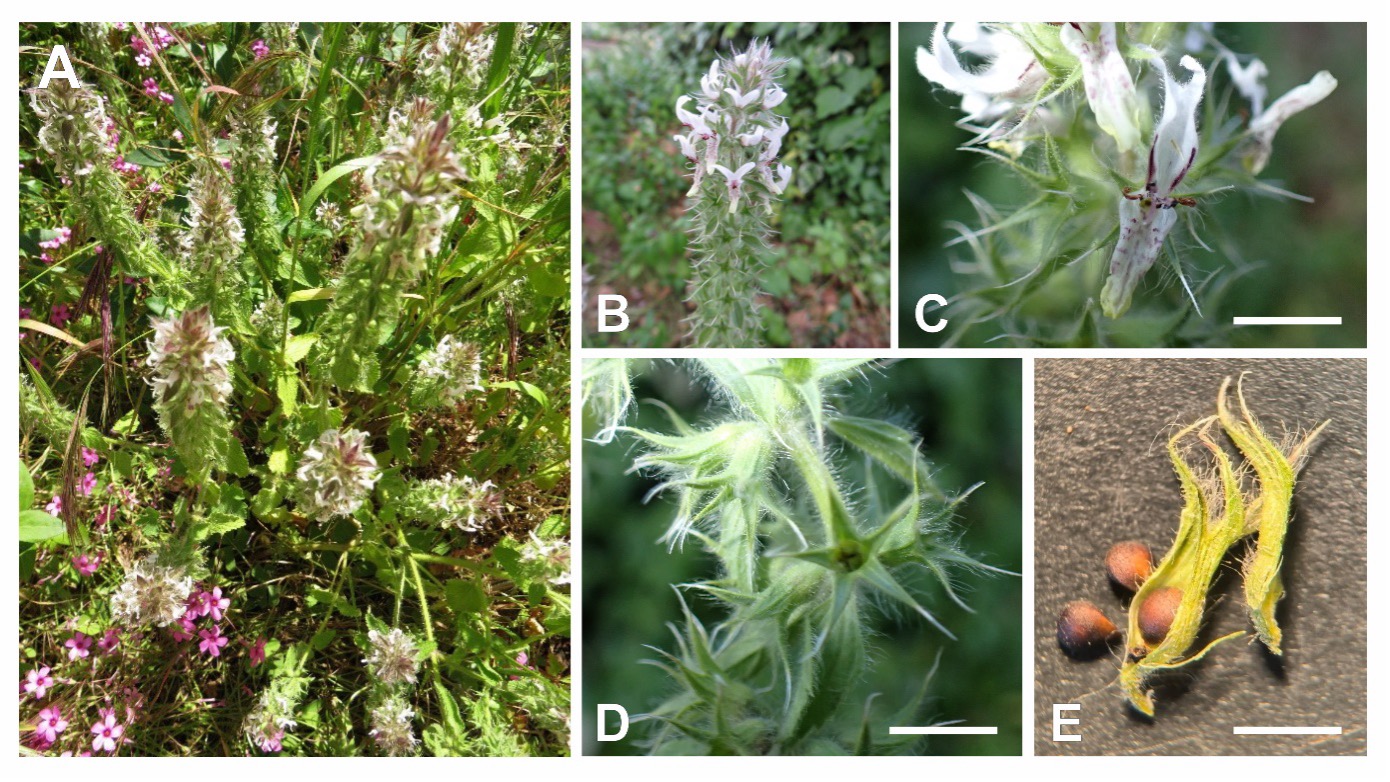 Fig. 2.Stachys ocymastrum in the Veli Iž village, the island of Iž, Zadar County, northern Dalmatia, Croatia. A – habitus, B – inflorescence, C – flower with a bifid erect upper lip and a violet pattern on the lower lip, D – calyx, E –mericarps and calyx. Scale bars: 5 mm (photos: A, B, E – D. Purger; C, D – M. Pandža).