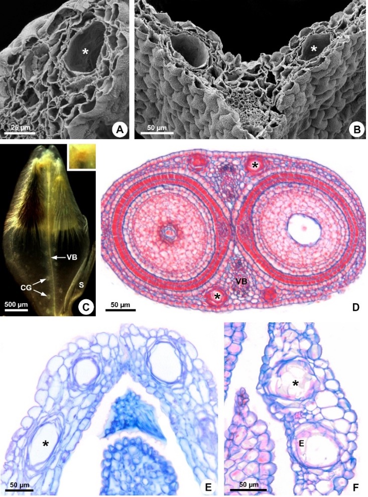 Fig . 1. Croceous glands (secretory cavities) in fruits (pericarp) and calyx of Senega longicaulis. Ellipsoidal cavity in the pericarp close to the septum (A), secretory cavities in the sepal near the vascular bundle (B), croceous glands forming two rows along with the pericarp vascular bundle, extending from the top to the base of the fruit (C); note the yellow secretion within the croceous gland (inset) and the presence of a persistent calyx with the fruit. Secretory cavities in the ovary near the synlateral vascular bundles (D), longitudinal rows of secretory cavities in the pericarp (E), secretory cavities in the sepal (F); note the presence of epithelium: CG – croceous gland, E – epithelium, S – sepal, VB – vascular bundle, asterisk – secretory cavity. Longitudinal sections (A, E). Transversal sections (B, D, F). Translucent fruit after fixation (C). Scanning electron microscopy (A-B). Stereomicroscopy (C). Light microscopy (D-F).
