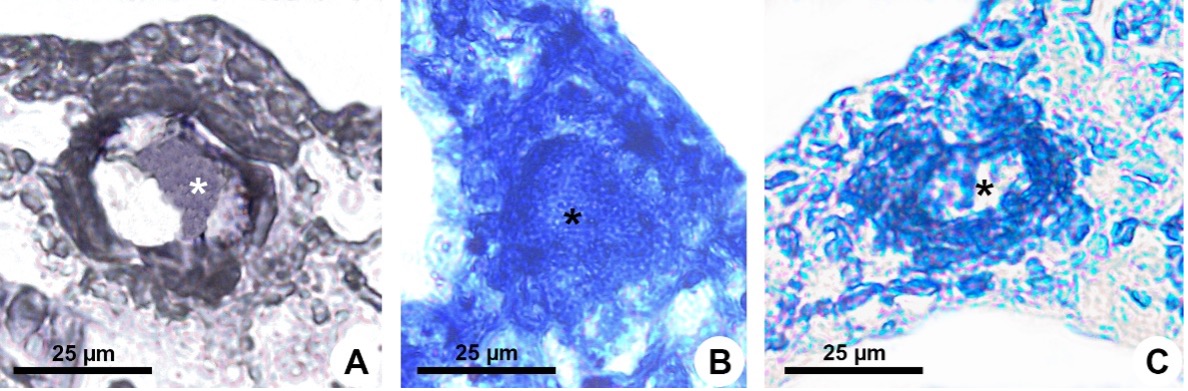 Fig . 3. Histochemical analysis of the croceous gland (secretory cavity) of Senega longicaulis. Lipids detected using Sudan black B (A), lipids stained with Nile blue (B), essential oils identified using Nadi reagent (C). Asterisk - secretion detected in the croceous gland lumen.