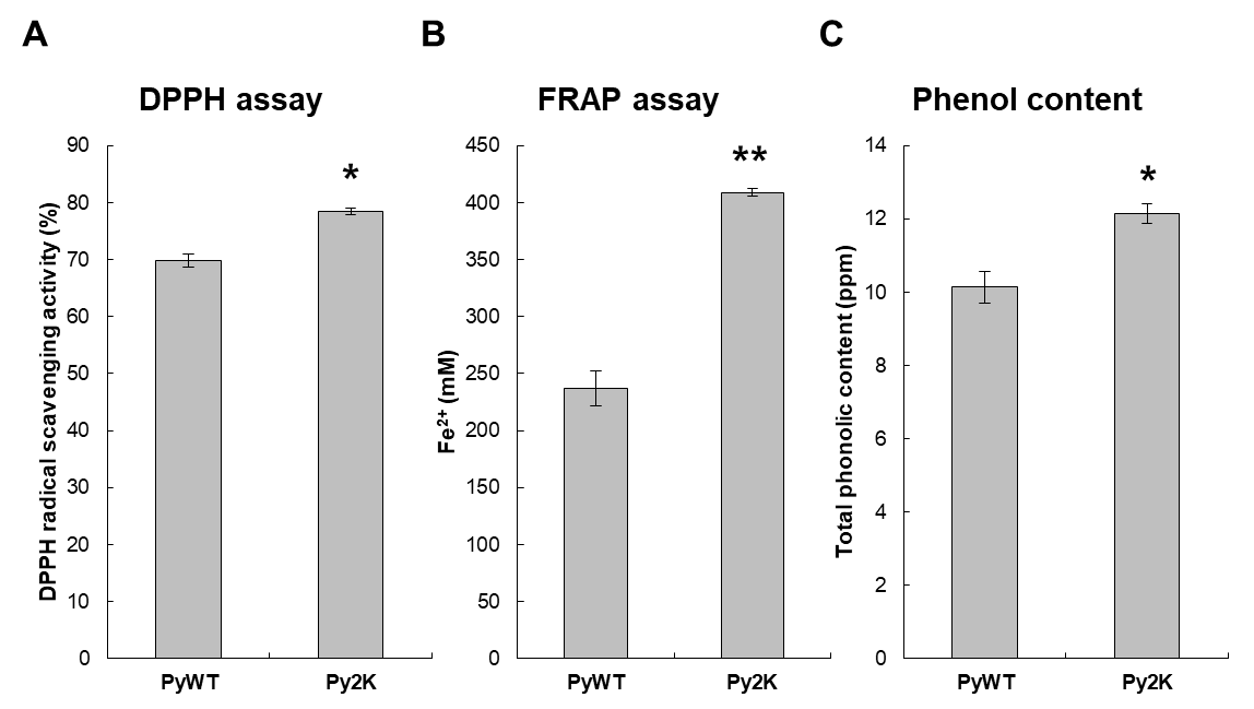 DPPH and FRAP assays were performed to confirm the increase in the antioxidant capacity of Py2K (Fig. 5A, B). DPPH radical-scavenging activity of Py2K was higher (78.43%) than that of PyWT (69.80%), while FRAP assay revealed a higher level of Fe3+ in Py2K (408.80 nM) than in PyWT (237.06 nM). We analyzed total phenolic content and found that the phenol content of Py2K was higher than that of PyWT (Fig. 5C).