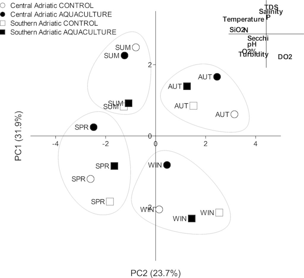 Fig. 2.Principal component analysis ordination graph of physico-chemical parameters of seawater column (T – temperature, SiO2 – silicon dioxide, N – total nitrogen, P – total phosphorous, Secchi – Secchi disc, Turb – turbidity, Sal – salinity, TDS – total dissolved solids, DO2 – dissolved oxygen, O2% – oxygen saturation; WIN – winter, SPR – spring, SUM – summer, AUT – autumn) . Number of samples = 16.