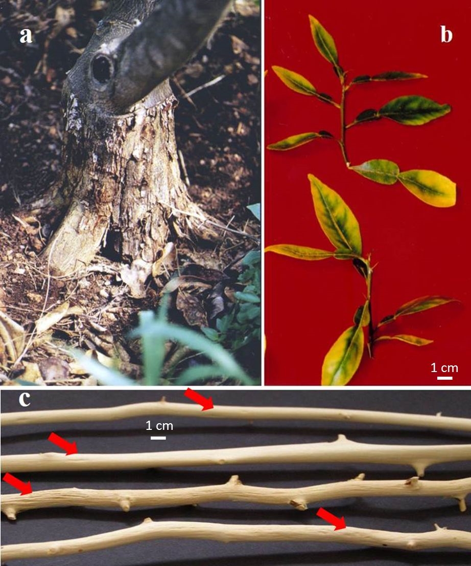 Fig. 4.Viroid and virus induced symptoms on citrus: a – bark shelling caused by Citrus exocortis viroid on Poncirus trifoliata (L.) Raf. rootstock of lemon (Citrus limon L.) on the island of Brač, Dalmatia, b – leaf chloroses induced by Citrus tristeza virus (CTV) on experimental Citrus wilsonii Tanaka, c – CTV induced stem pitting symptoms on citrus indicators. The number of pits (red arrows) increases with the virulence of stem pitting inducing CTV strain.