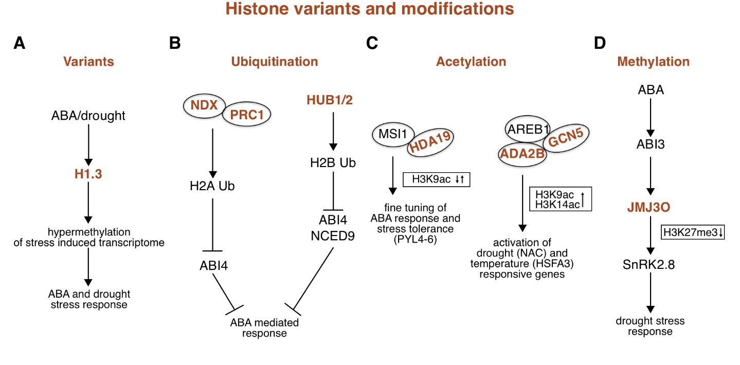 Extreme changes in environmental conditions are the main cause of abiotic stress and pose a major challenge for plant survival. In addition to controlling stress-related gene expression through a signal transduction cascade, ­epigenetic regulation plays an important role in orchestrating rapid and precise responses of plants to dynamic changes in environmental conditions. Complex mechanisms such as DNA methylation, especially via the de novo pathway, and histone tail modifications such as methylation, acetylation, phosphorylation, ubiquitination, and SUMOylation are involved in plant stress responses. In addition, histone variants and chromatin structure contribute to the dynamic regulation of chromatin state and determine whether it remains open or closed. Here, we summarise the complex combination of epigenetic modifications and factors that together regulate plant response to climate stress, focusing on the interplay between epigenetic mechanisms and the phytohormone abscisic acid.