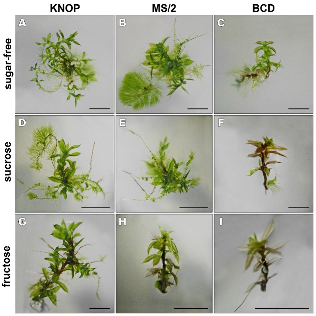 The establishment of axenic cultures and the propagation of the rare moss Entosthodon pulchellus (H. Philip.) Brugués (Funariaceae), as well as the optimisation of its ex situ growth conditions and rapid biomass production were the goals of this study. The results obtained also provide insights into the developmental biology of this moss in in vitro conditions, particularly regarding basal media contents with or without supplements of selected plant growth regulators or sugars, i.e. its nutritional needs. The procedure for establishing axenic cultures of this rare and threatened moss species is described. The optimisation protocol of the growth and production conditions is elaborated. The spore germinability of dried herbarium samples remained rather high in the tested laboratory conditions. Suitability tests on different media types showed KNOP basal media to be the best fit for the rapid biomass production of both secondary protonemata and leafy gametophores, without the addition of sugars or plant growth regulators. However, sugar, namely sucrose, induced rapid and massive protonemal development and can be used when this developmental stage is needed.