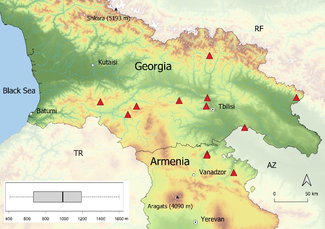 Fig. 1.Distribution of the reported Stellaria ruderalis sites (red triangles) in Georgia and Armenia. A boxplot provides median (bold line), interquartile range (box) and range of values (whiskers) of elevation of the sites.