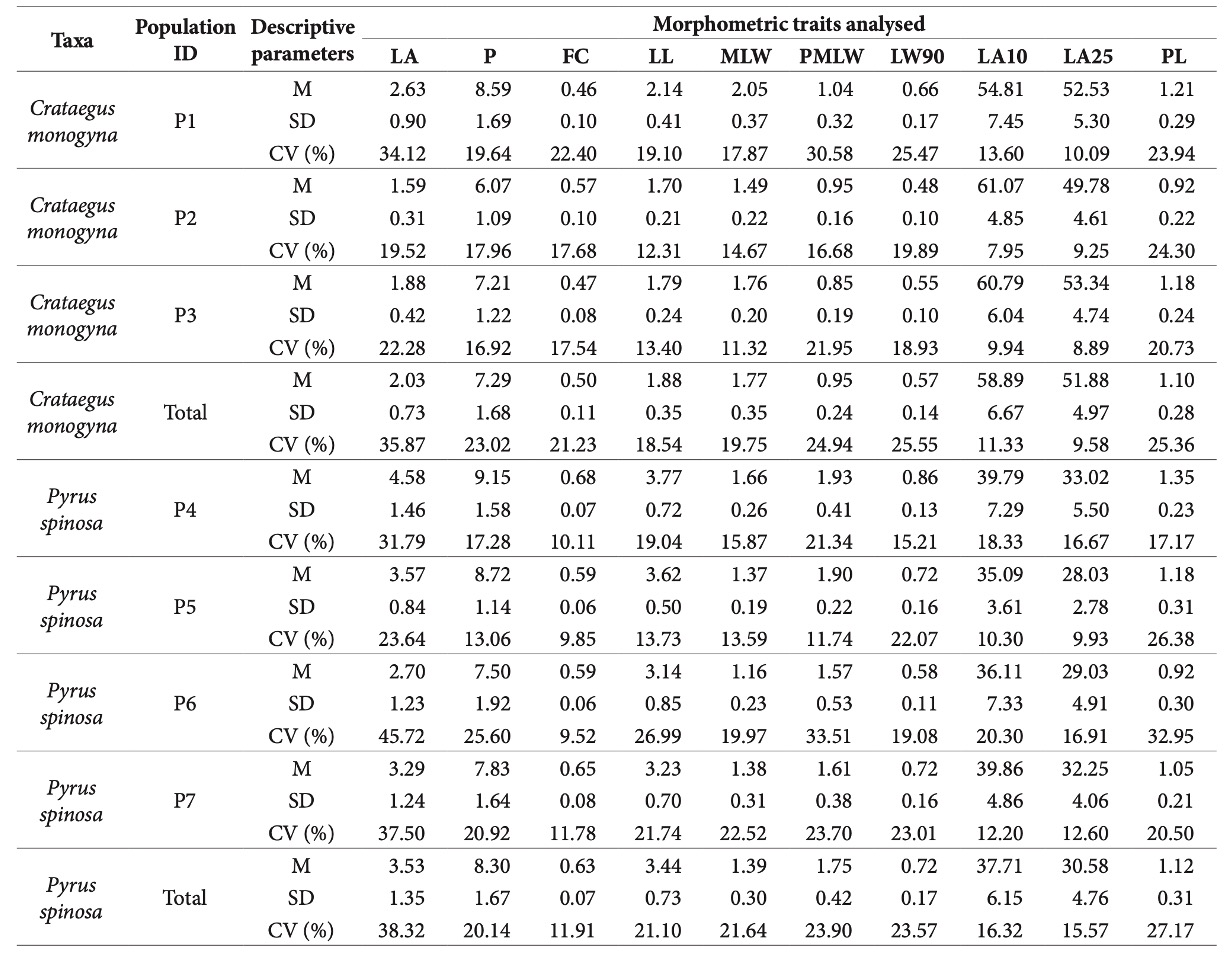 Leaf dimensions of C. monogyna obtained in this research were slightly lower compared to the length and width of 3-5 cm listed by Schuck (2008), and within the range of 1-6 cm stated by Fichtner and Wissemann (2021) and Khadivi et al. (2019). The petiole length of 1.10 cm fits within the ranges listed by all the above mentioned authors (1-3 cm). On the other hand, leaf dimensions of P. spinosa were in accordance with previous descriptions of 2.5-7 cm long and 1-3 cm wide leaves with a petiole of 1-2 cm (Idžojtić 2009, Zamani et al. 2012, Vidaković et al. 2021). In both species, the leaf area (LA) and petiole length (PL) were the most variable traits, with CV values above 30% in LA and 25% in PL. Such a pattern of variability is very common among woody species (Khadivi-Khub et al. 2015, Kumar et al. 2018). In C. monoygna, the coefficients of variability in the majority of the measured leaf traits were very similar to that obtained by Khadivi et al. (2019), but significantly higher than in Khadivi-Khub et al. (2015). However, their respective studies did not include leaf area. Coefficients of variability in P. spinosa traits ranged from 11.91 to 38.32%, which is lower than the range of 18.02-45.62% obtained by Vidaković et al. (2021).