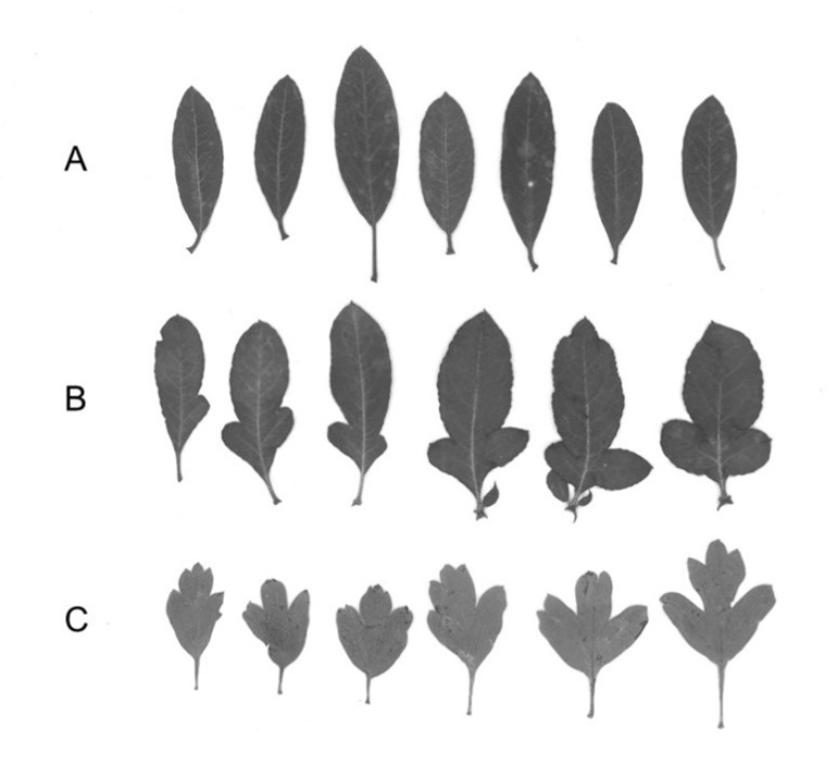 Fig. 3. Leaf variability of Pyrus spinosa (A), possible hybrid between P. spinosa and Crataegus monogyna (B) and C. monogyna (C) from the Nin in the eastern Adriatic.