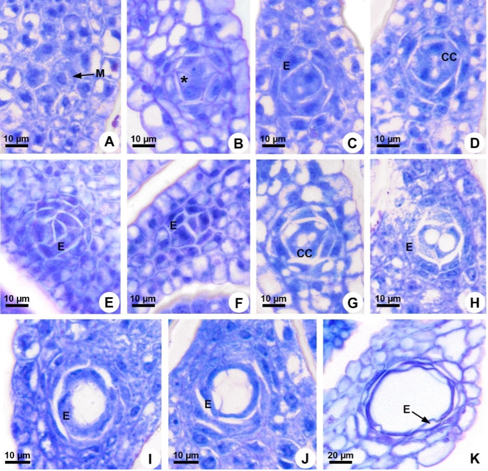 Fig . 2. Ontogeny of the croceous gland (secretory cavity) of Senega longicaulis. Meristemoid, i.e., initial cell of the cavity (A), first division of the meristemoid (asterisk) (B), periclinal division giving rise to the layer that will originate the epithelium (C), subsequent cell divisions forming a cluster of meristematic cells (D-F), vacuolation of the central cells; beginning of the programmed cell death (G), separation (schizogeny) of the epithelium from the central cells, which are dying (H), epithelium in secretory activity after the lysis of the central cells (I-J). Epithelium in post-secretory phase (K), Ovary (A-J) and pericarp (K). M – meristemoid, CC – central cells, E – epithelium.